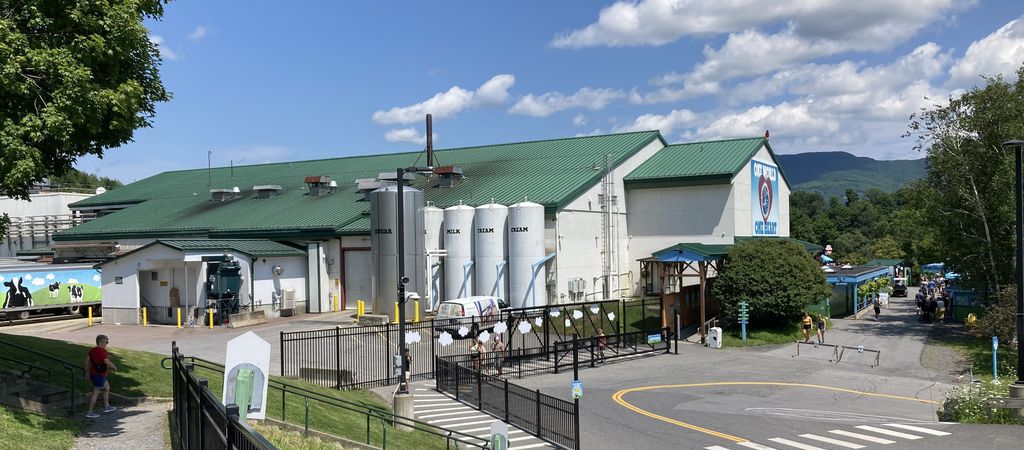 - This being said, the real highlight of the Vermont trip (especially for the Junior Navigators) was a stop at the Ben and Jerrys factory in Waterbury (Exit 10): That’s right—the ice cream mecca. Ben and Jerry’s clearly leaned into customer interest for on-site visits, because the place is designed to accommodate hundreds of people at once: multiple parking lots are placed ever higher on the hill, leading to factory tours, an ice-cream parlour, tie-dye shirt making, and whatever is required to support tour buses dropping by for refreshments. The place was packed on a sunny Tuesday afternoon—so much so that factory tours had a two-hour waiting list (we declined) and there was a long line to buy ice cream—which we still did. While eating, we were joined by my sister, brother and law and the other Junior Navigator—their trip had been different and stopped in different places, but we had agreed to meet again for ice cream. If you go, don’t forget to climb up the hill to visit the “Flavor Graveyard,” which pays homage to former flavours with poetry and gravestones in a relaxing shady area.