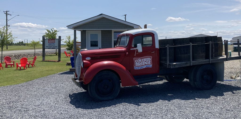 Our next stop in Waterville, Potato County, was more a pilgrimage than a tourist stop. Sometime during the pandemic, our local grocery store tentatively started carrying Covered Bridge chips. I was so taken by them that I ordered a big sampler box by mail, and have been a fan ever since. Let me put my cards on the table: Covered Bridge chips are the best on the market. They roast their Russet potatoes (with skins!) a bit darker than usual to give them a wonderfully more pronounced taste and their choice of seasonings is exceptional. In other words: I had to stop at their headquarters. Or rather what’s left of their headquarters: In 2024, a fire destroyed their main factory building and while production of the chips was outsourced (with no perceptible dip in quality), the publicly accessible portion of the company is currently a double set of trailers acting as a gift shop. They are rebuilding, though—the cashier described how the new facilities (to be completed in the next year) will include a restaurant, gift shop and factory tours. (I shared that in the Ottawa area, a fire similarly destroyed the St. Albert factory, but the rebuilt facility was better than ever with a restaurant, shop and self-guided tour area.)