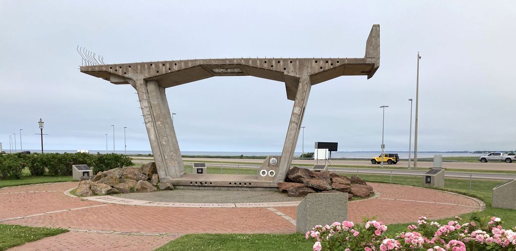 My first stop after the bridge was the Borden-Carleton Visitor Information Center, which feels like a small village specifically made for tourists, with its central visitor centre surrounded by a cluster of restaurants and gift shops. My interest in the place laid elsewhere: the Confederation Bridge Monument, which soberly tells about the construction of the bridge and features a scale replica (still big!) of the bridge’s girders. Engraved bricks set in the ground around the girder feature the names of those who built the bridge.